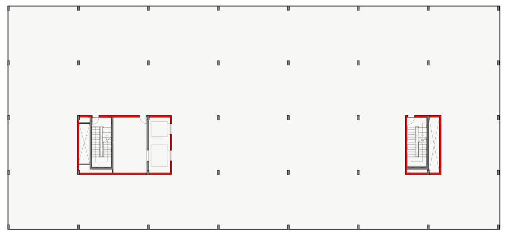 Locating circulation and services in centralized cores keeps the rest of the floor plate open and flexible. For larger floor plates, dividing the core into two or more zones can create multiple MEP spines and reduce horizontal distribution distances.