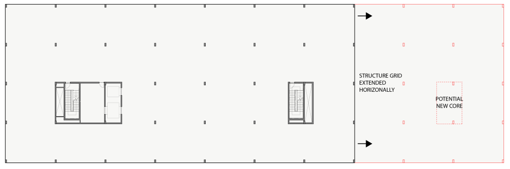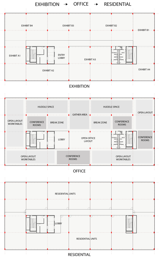 The image below illustrates how a consistent structural grid can support multiple uses, enabling the building to be repurposed over time.